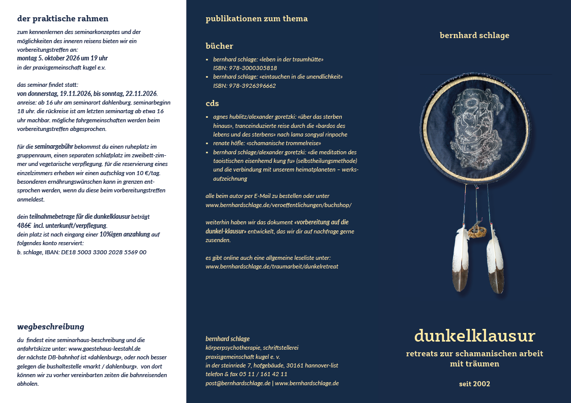 - schlage, bernhard: eintauchen in die unendlichkeit; schamanische arbeit mit träumen während des aufenthaltes in völliger dunkelheit; berlin 2016