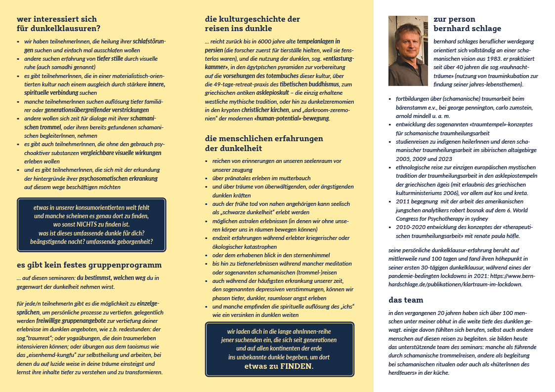 seminare, die sensorische deprivation von licht anbieten, werden seitdem im deutschsprachigen raum auch unter den bezeichnungen dunkelretreat, darkretreat und darkroom-retreat angeboten. ich verbinde diese arbeit mit den schamanischen traditionen der «trommelreise», um menschen die bedeutung ihrer träume als orientierung für ihr alltägliches leben erfahrbar zu machen (2).